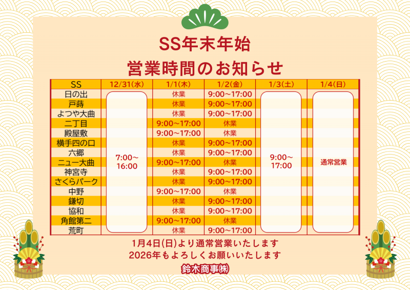 年末年始期間中の各SSの営業時間につきまして、下記の通りご案内申し上げます。