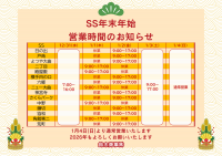 平素より当社サービスステーションをご利用いただき、誠にありがとうございます。年末年始期間中の各SSの営業時間につきまして、下記の通りご案内申し上げます。12月31日 全店7:00~16:00 1月1日 SSごとに営...